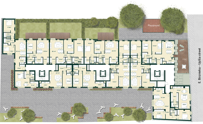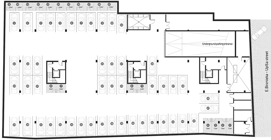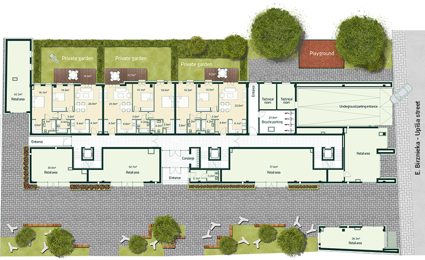 The building main courtyard is planned as the ‘Upīša Passage’ continuity- both as spatial uniqueness and commercial potential.